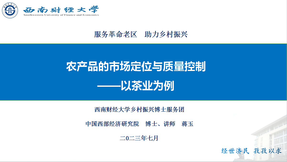 蒋玉博士基于STP(Segmenting Targeting Positioning)战略理论,结合自己的前期研究与在通江的初步调研,以茶叶为例,具就通江农产品的市场定位问题作了交流。蒋玉提出,就茶叶而言首先需要考虑目标市场,是根植于本土市场还是大市场;本土需求可以简化为集体(政府与企业)采购需求及散客消费者需求;在考虑集体采购需求时,性价比是重点,同时丰富产品组合,保留用户选择权。蒋玉建议加强按需定制包装设计,加强产品质量控制,注重打造本土产品特色与独特竞争优势。