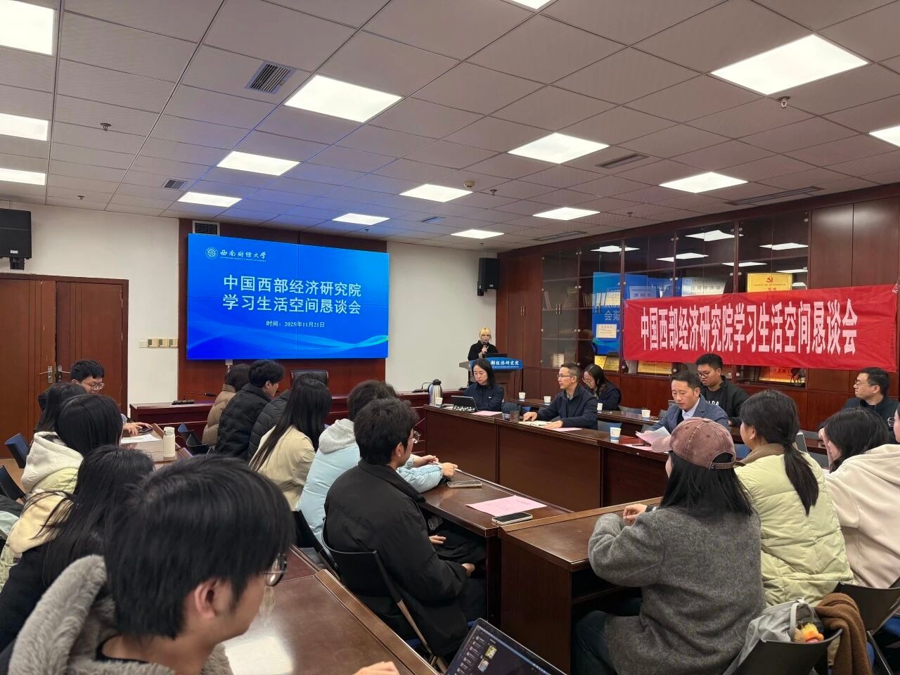 党委书记冯卫东,副院长吕朝凤,党委副书记、纪委书记史雪聃及辅导员肖霄、徐跃辉,教学秘书罗侃、方彬等教师代表出席本次会议。全院各硕博班级学生代表参加座谈交流,研究生会王佳馨同学主持会议。